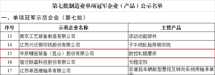 近日,工業(yè)和信息化部、中國(guó)工業(yè)經(jīng)濟(jì)聯(lián)合會(huì)組織開(kāi)展了第七批制造業(yè)單項(xiàng)冠軍企業(yè)(產(chǎn)品)培育遴選工作,江蘇省工業(yè)和信息化廳公布了第七批制造業(yè)單項(xiàng)冠軍企業(yè)擬認(rèn)定名單,周市鎮(zhèn)華辰精密裝備(昆山)股份有限公司成功入選,是昆山首家獲此殊榮的企業(yè),實(shí)現(xiàn)了從省級(jí)專(zhuān)精特新中小企業(yè)、國(guó)家級(jí)專(zhuān)精特新“小巨人”企業(yè)到國(guó)家級(jí)制造業(yè)單項(xiàng)冠軍企業(yè)“三級(jí)跳”。